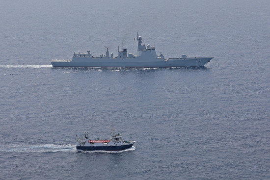 整个航渡过程中,编队指挥所与船队保持密切沟通,每小时按照“被护船只、领队船、乌鲁木齐舰、编队指挥所”的顺序报告一次综合情况,采取雷达警戒、红外观察等多种方式,昼夜不间断对海面情况进行监视,并出动舰载直升机开展立体巡逻警戒,特战队员加强夜间观察瞭望,确保被护渔船和人员安全。
