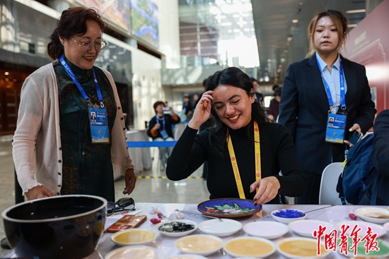 10月16日,第三届“一带一路”国际合作高峰论坛新闻中心,智利《公民报》记者玛利亚·圣胡埃萨(中)在体验景泰蓝制作技艺。中青报·中青网记者 曲俊燕/摄