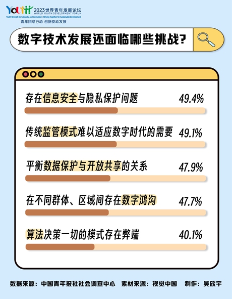 随着数字技术的飞速发展,我们也面临更多机遇和挑战。在世界青年发展论坛召开前夕,中国青年报社社会调查中心联合问卷网(wenjuan.com)进行的“青年数字发展”调查显示(2001人参加),49.4%的受访青年指出数字技术发展存在信息安全与隐私保护问题。61.8%的受访青年建议引导青年提高网络信息辨别力,破除“信息茧房”,51.8%的青年建议提供更人性化、更贴合青年特点的智能服务。