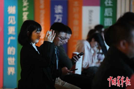 10月25日,“真青春·活出彩·书香为伴·梦想启航”活动现场,一位听众用手机拍摄分享会。中青报·中青网记者 陈剑摄