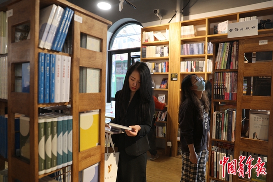•     10月25日,位于北京前门大街附近的温暖的BaoBao·两岸·青年书店内,两位女士在书架前驻足。中青报·中青网记者 陈剑摄