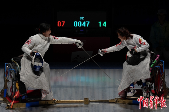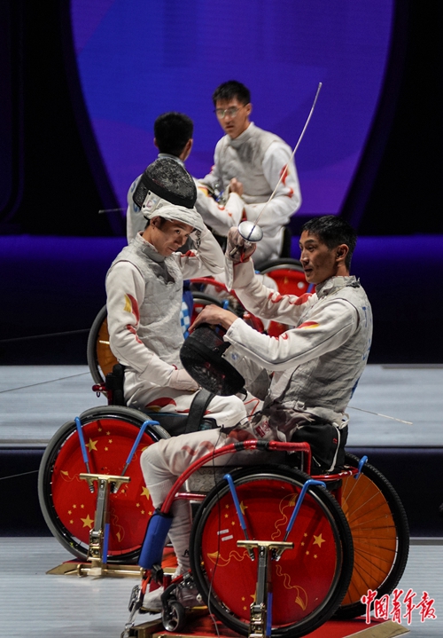 10月25日,浙江杭州,杭州电子科技大学体育馆,杭州亚残运会轮椅击剑项目男子花剑个人A级半决赛中,4名中国选手同场竞技。