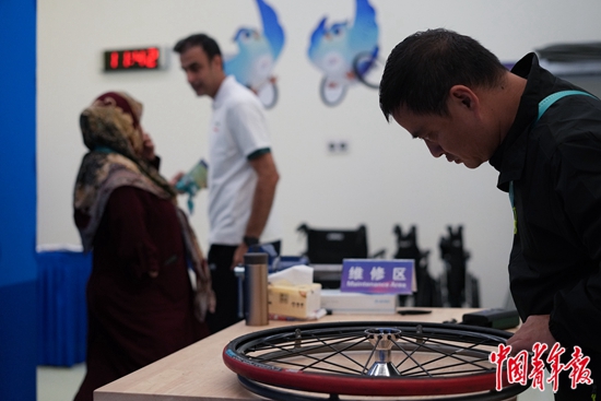 10月25日,浙江杭州,杭州奥体中心体育馆轮椅等辅助器具维修站内,技师林伟征为一位伊朗运动员的轮椅换胎,伊朗代表团工作人员在一旁等待。本届亚残运会在亚残运村、淳安分村以及轮椅篮球、田径、游泳、射击、羽毛球等10个竞赛场馆都设有维修站,共有67名技师为运动员进行日常设备维修、维护。