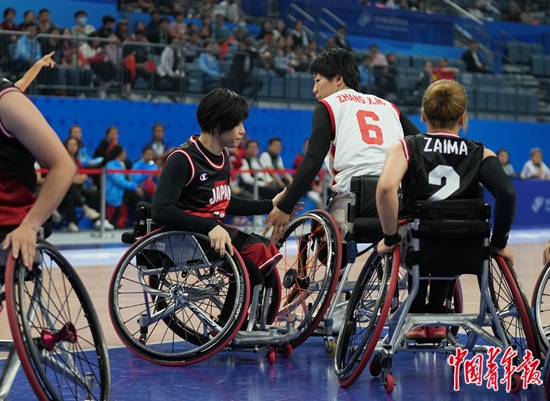 10月26日,浙江杭州,杭州奥体中心体育馆,杭州亚残运会轮椅篮球女子金牌赛,中国队6号张雪梅(右二)摔倒后,日本队球员萩野真世(右三)伸手帮助,两人拍手致意。本场比赛中,中国队61∶30大比分战胜日本队,夺得该项目金牌,实现了亚残运会该项目三连冠。
