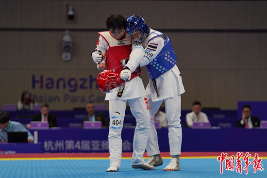 10月24日,浙江杭州,萧山瓜沥文化体育中心,杭州亚残运会跆拳道男子K44级63KG复活赛中,中国选手倪喆懿(左)负于泰国选手塔纳攀·索提赛特,无缘半决赛。赛后,塔纳攀·索提赛特主动拥抱失落的倪喆懿。