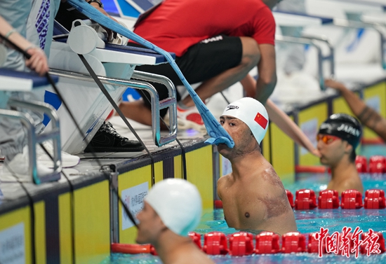 10月24日,浙江杭州,杭州奥体中心游泳馆,杭州亚残运会男子50米仰泳S5级预赛第2组即将开始,中国选手袁伟译用嘴咬住毛巾,做好准备姿势。他最终夺得该项目冠军。S5级针对协调性受到中度影响、中部躯干和腿部活动受到重度影响或肢体缺失的游泳运动员。