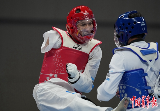 10月24日,浙江杭州,萧山瓜沥文化体育中心,48岁的哈萨克斯坦选手楚马加利·叶尔扎诺夫(左)在杭州亚残运会跆拳道男子K44级70KG复活赛上。跆拳道是本届亚残运会新增的5个项目之一,只设立竞技类K44一个级别,针对身体一侧协调性受到轻度影响、单臂或单脚和脚踝受到重度影响或手臂局部缺失的跆拳道运动员。