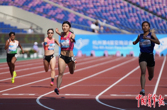 10月23日,浙江杭州,黄龙体育中心体育场,中国选手李露(左三)在杭州亚残运会女子200米T47级决赛中冲线。她在该项目比赛中以25秒68的成绩获得银牌,泰国选手沙西拉旺·因达措以25秒58夺冠。T47级针对单臂活动受到轻度至中度影响或肢体缺失的跑步运动员。