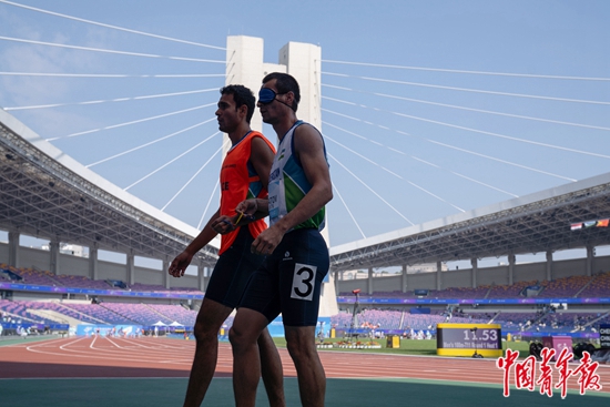 10月23日,浙江杭州,黄龙体育中心体育场,杭州亚残运会田径男子100米T11预赛后,乌兹别克斯坦选手米兰·萨哈托夫(右)戴着遮光眼罩,由一旁的领跑员引导,准备离开。T11级针对视力近乎完全受损的跑步运动员。