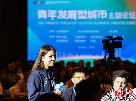 10月31日下午,广东深圳,2023年世界青年发展论坛青年发展型城市主题论坛上,来自冰岛的复旦大学在读博士研究生天一准备登台,参与发布《青年发展型城市建设深圳倡议》。中青报·中青网记者 李峥苨/摄