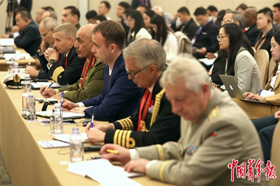 10月29日至31日,第十届北京香山论坛在北京举行,主题为“共同安全、持久和平”,除举办4场全体会议、8场分组会议外,还有“中外名家对话”“中外青年军官学者研讨会”“孙子兵法专题研讨会”等专题研讨,并安排了特色参访活动。本届论坛共有99个官方代表团、19国国防部长、14国军队总长(国防军司令)、6个国际组织代表及专家学者和各国观察员等1800余名嘉宾出席。参会代表数量和层级创历史新高,发展中国家、国际和地区组织的参与度大幅提升。图为第十届北京香山论坛中外青年军官学者研讨会上,参会代表聆听发言。中青报·中青网记者 王裴楠/摄