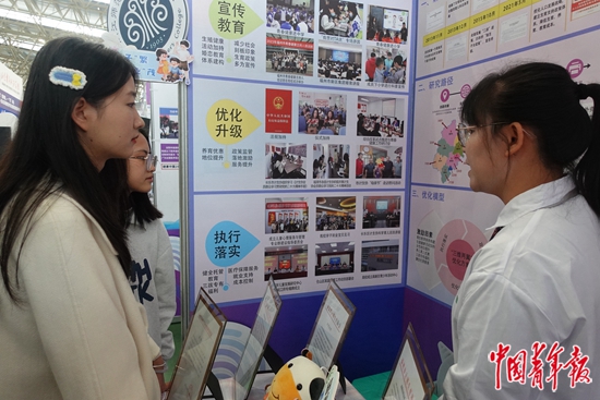 展区内,参赛学生互相分享项目研究经验。中青报·中青网见习记者 王姗姗/摄