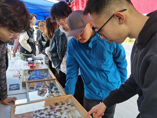 中国农业大学昆虫爱好者协会成员向同学们展示昆虫标本。中国农业大学昆虫爱好者协会供图
