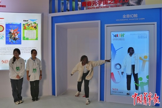 10月31日,北京首钢园,2023年世界青年发展论坛青年数字发展主题论坛外,外国参会者体验中国青年报社“青春元宇宙之家2.0”互动展示——“全息幻舱”。中青报·中青网记者 赵迪/摄