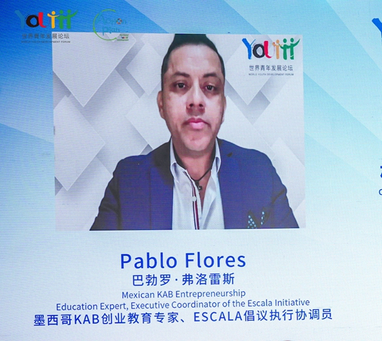 11月3日,大连,青年创业国际论坛。墨西哥KAB创业教育专家巴勃罗·弗洛雷斯线上介绍情况。