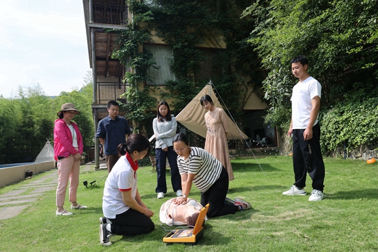 6月15日,浙江湖州德清县莫干山镇仙潭村一家民宿内,民宿管家在红十字会应急救护培训师的指导下进行人工心肺复苏培训。视觉中国供图