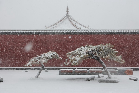 2023年11月6日,沈阳故宫博物院内,白雪妆点红墙。