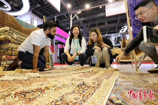 11月6日,上海国家会展中心,第六届中国国际进口博览会消费品展区,来自伊朗的波斯地毯以其精美的图案、细腻的质感受到参观者的喜爱。中青报·中青网记者 李建泉/摄
