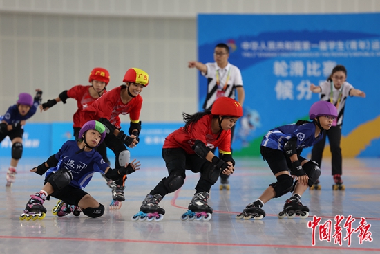 11月5日,广西南宁,第一届学青会女子轮滑阻拦比赛赛场,广西南宁市队与浙江温州市队在半决赛中,一名温州小选手险些摔倒。当天,学青会轮滑阻拦项目进入第三个比赛日,来自各代表团的小选手在赛场上挥洒汗水,诠释青春激情。中青报·中青网记者 曲俊燕/摄