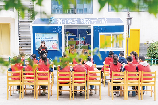 “坚守法律底线,做网络安全的践行者;强化安全意识,做网络安全的维护者……”在相城区元和小学“相守e城”网络元气站,一场网络安全主题户外教育课正在进行。10余位青少年通过现场聆听网络文明宣讲、参加网络知识问答、打卡网络文化漂流书屋,沉浸式体验这一专门为青少年打造的网络素养教育实境空间。