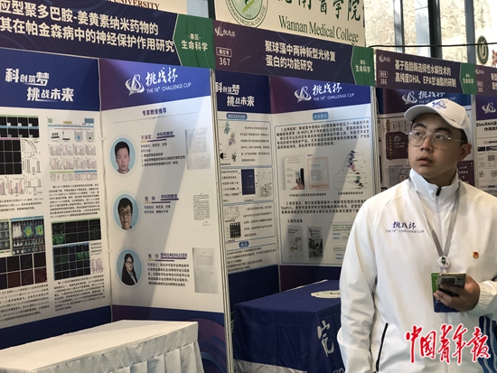 10月28日至30日,第十八届“挑战杯”全国大学生课外学术科技作品竞赛终审决赛在贵州大学举行,图为一名志愿者在科技成果展厅参观。中青报·中青网记者 李雅娟/摄