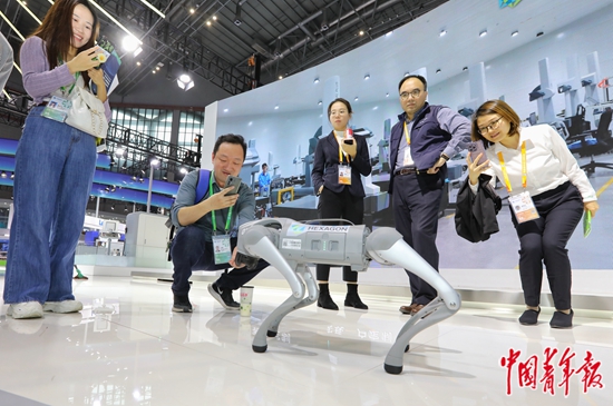 11月9日,上海国家会展中心,第六届中国国际进口博览会装备技术展区,参观者围观海克斯康展台的机器狗。这台机器狗能实现自主式三维实景采集,在大型工厂或危险场景,替代人进行自动巡检,建构实景图。第六届进博会中的技术装备展区,共设数字工业自动化、集成电路、能源低碳及环保技术、人工智能四大专区,并设数字打印及光学技术、金属加工、应急抢险三大板块。其中展出的人工智能领域的相关进展,是外界密切关注的焦点之一。中青报·中青网记者 李建泉/摄