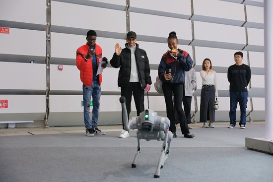 11月9日,浙江省桐乡市乌镇,2023年世界互联网大会“互联网之光”博览会,3名来自摩洛哥的青年驻足观看“仿生四足机器人”的现场展示。田嘉硕/摄