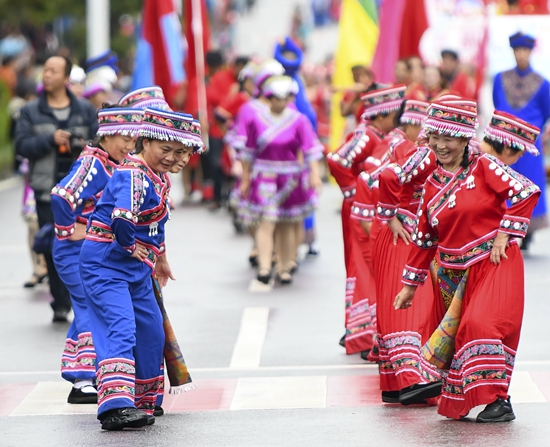 11月11日,摆手舞队伍在湖北省恩施土家族苗族自治州来凤县城武汉大道上表演。当日,来凤县举办第三届土家摆手舞文化节,吸引来自贵州、湖南、湖北、重庆等省市的千余名摆手舞爱好者参加展演、巡游等活动,向市民和游客展示土家非遗摆手舞的独特魅力。唐俊/摄(新华社发)