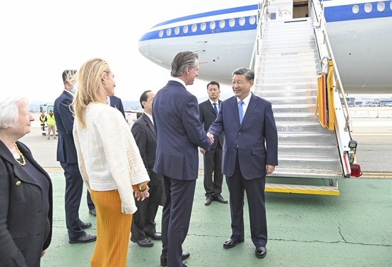 习近平乘坐专机抵达旧金山国际机场时,受到美国加利福尼亚州州长纽森、财政部长耶伦等美方代表热情迎接。新华社记者 谢环驰/摄