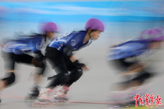11月5日,广西南宁,学青会女子轮滑阻拦半决赛,浙江省温州市队选手在比赛中。中青报·中青网记者 曲俊燕/摄