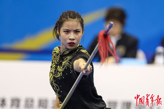11月14日,广西南宁,学青会武术女子枪术比赛,安徽省滁州市队选手李子旋在比赛中。中青报·中青网记者 曲俊燕/摄