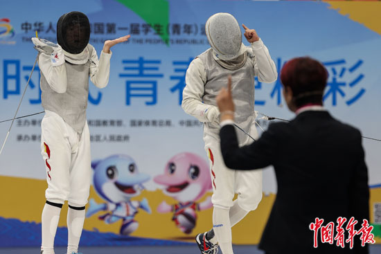 11月8日,广西南宁,学青会击剑比赛男子花剑个人决赛,安徽省合肥市队选手郭一凡(左)对阵福建省厦门市队选手刘钦汇,比赛中,郭一凡对一个判罚产生异议,于是与裁判沟通。中青报·中青网记者 曲俊燕/摄