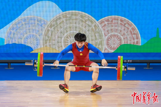 11月7日,广西南宁,学青会举重女子59公斤级比赛,福建省福州市队选手林经纬在抓举第三把中未将杠铃举起。中青报·中青网记者 曲俊燕/摄