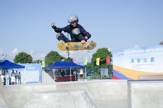 11月4日,第一届全国学生(青年)运动会滑板决赛在广西北海举行,在男子碗池项目比赛中,杭州亚运会冠军、广东省广州队的选手陈烨夺冠。视觉中国供图