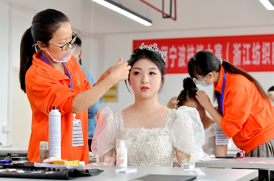 桌上摆放着眉笔、腮红、粉底液和各种美发工具……若不是现场鸦雀无声,还有裁判员巡视,这场面一定会被认成一场大型演出前的化妆现场。近日,第二届宁波技能大赛系列赛项之一——形象设计赛项在浙江纺织服装职业技术学院举行,来自全市的中职专业教师、行业能手、企业等22名选手参加竞赛。这是一场考验选手指上功夫的“造美比赛”。王国海/摄