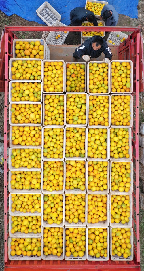 11月11日,湖南省永州市道县东门街道新立村,果农将脐橙装车。(无人机拍摄)视觉中国供图