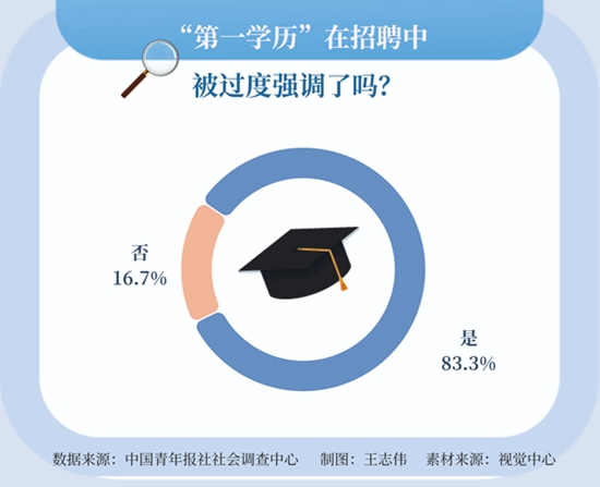 又是一年求职季,随着毕业生人数的增多,不少用人单位的选拔标准越来越高,选拔方式也层出不穷,学校专业、学习绩点、实习经历,包括“第一学历”都可能成为筛选条件。日前,中国青年报社社会调查中心联合问卷网(wenjuan.com)发布的一项有1000名受访者参与的调查显示,超八成受访者感觉“第一学历”在招聘中被过度强调了。