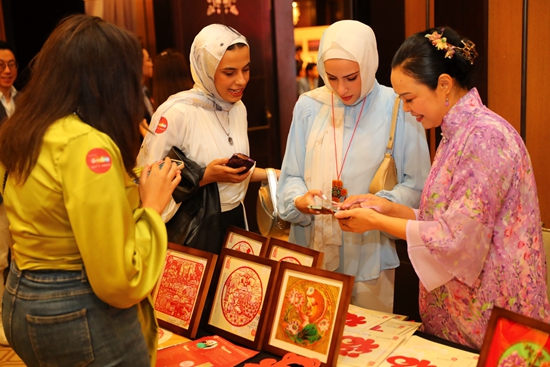 11月19日,在埃及开罗举行的粤港澳大湾区世界级旅游目的地推介暨“魅力广东”视觉展上,人们在非遗展区了解剪纸。