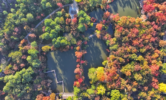 11月19日,江苏省苏州市。初冬时节,素有“天平红枫甲天下”之美誉的苏州天平山“枫”景已进入最佳观赏期,色彩斑斓的各色树叶美如画卷。视觉中国供图