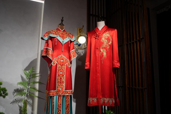 据顾玲玲介绍,这是中国人独有的浪漫。中式嫁衣大都采用红色与金色的搭配,大气而富贵,中间穿插不同的刺绣,如龙凤呈祥、凤穿牡丹、鸳鸯戏水,这些都是年轻人青睐的。