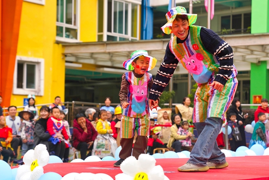 11月21日,在四川省泸州市玉带河幼儿园内,小朋友和家长展示用旧材料制作的创意服装。当日,该幼儿园举办了一场垃圾分类亲子时装秀,小朋友和家长身着用废纸壳、塑料袋、旧报纸等材料制作的各类创意服装走上舞台进行展示,让低碳生活、变废为宝的理念深入幼儿心灵。杨尚威/摄(新华社发)