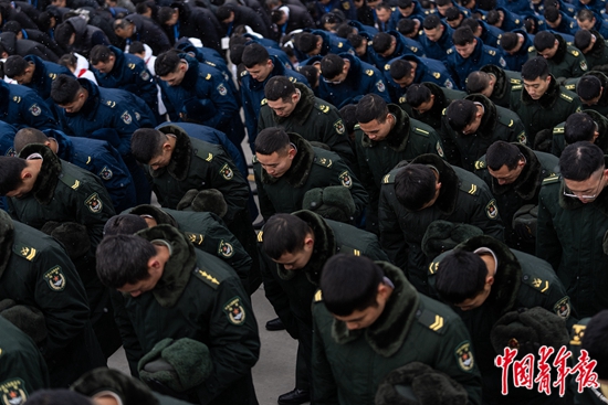 奏国歌环节结束后,现场全体人员向烈士遗骸三鞠躬,以此表达对先烈们的深切缅怀和无限哀思,随后礼兵护送棺椁登上军用卡车。