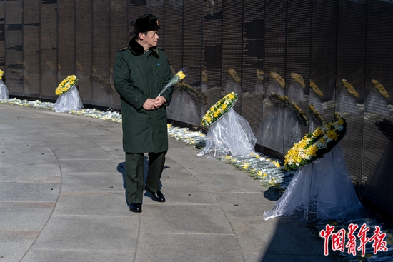 11月24日,辽宁沈阳,第十批在韩中国人民志愿军烈士遗骸安葬仪式在沈阳抗美援朝烈士陵园举行,一名参加安葬仪式的代表瞻仰烈士英名墙。