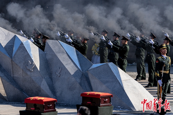 11月24日,辽宁沈阳,第十批在韩中国人民志愿军烈士遗骸安葬仪式在沈阳抗美援朝烈士陵园举行,27名礼兵鸣枪12响。
