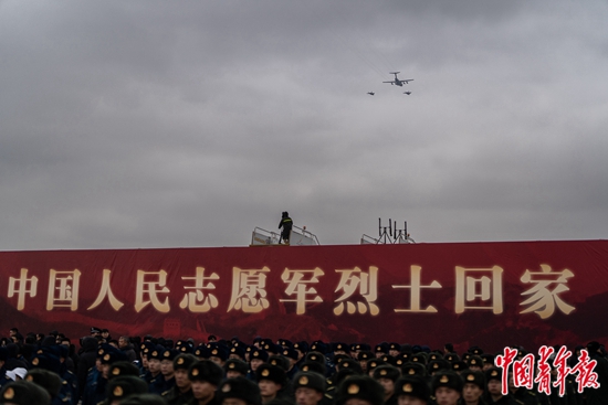 11月23日,辽宁沈阳桃仙国际机场,第十批在韩中国人民志愿军烈士遗骸迎回仪式现场,载有烈士遗骸棺椁的运-20飞机即将抵达,两架歼-20战斗机护航。