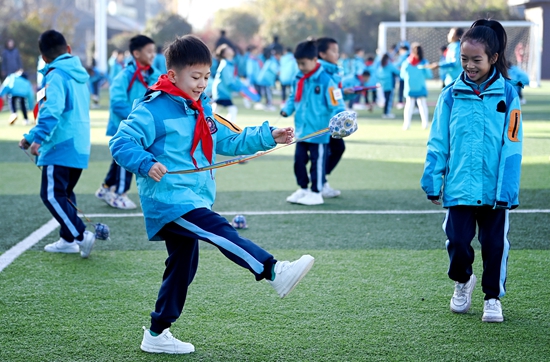 为丰富课间活动内容,提升课间活动质量,西安市曲江第六小学结合每个年龄段学生的特点,设置了五禽操、踢毽子、跳皮筋等活动,让孩子们在体育锻炼和趣味游戏中增强体质、乐享童年。新华社记者 刘潇/摄