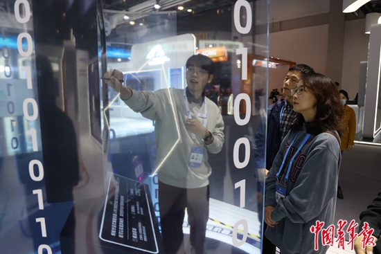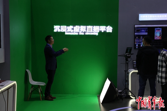 一位来自四川的参展商代表向参观者介绍沉浸式虚拟直播平台的使用。利用该平台,用户可以搭建自己的演播室,开展直播带货、新品发布、教学培训等活动,利用数字技术助力产品和服务的推广。中青报·中青网记者 王鑫昕/摄