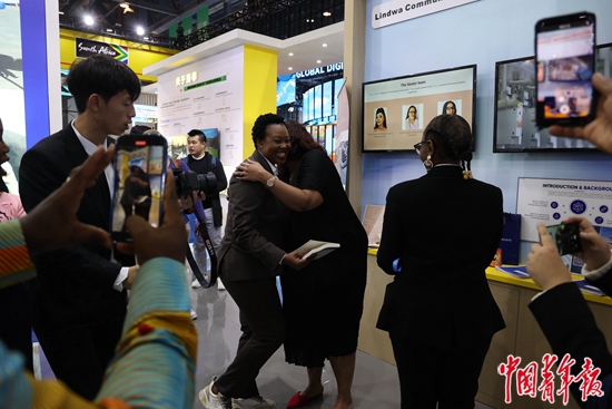 11月24日,第二届全球数字贸易博览会上,南非小企业发展部部长丝特拉·恩达贝尼-亚伯拉罕斯(右三)前往南非馆参观,并与南非参展商交流。此次“数贸会”上,南非作为主宾国之一参展。中青报·中青网记者 王鑫昕/摄