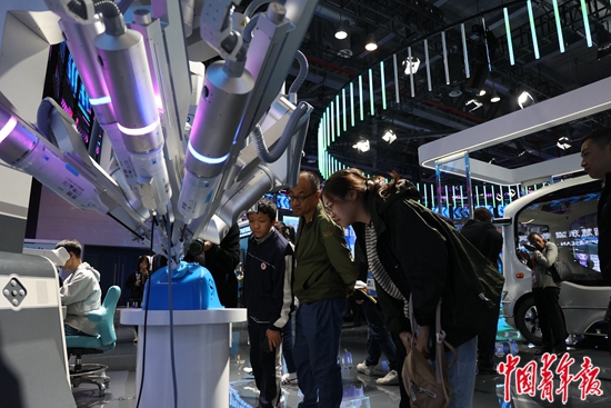 11月23日,在浙江杭州举行的第二届全球数字贸易博览会上,参观者在观察一款手术机器人演示剥鹌鹑蛋壳。中青报·中青网记者 王鑫昕/摄
