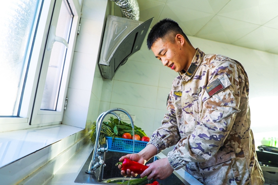 哨所打好水井后,武警青海总队海西支队某中队官兵吃水难的问题得到了有效解决。图为战士用净化后的地下水洗菜。杨浩/摄